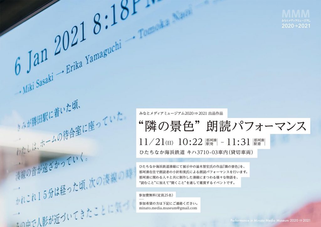 ひたちなか海浜鉄道湊線にて展示中の澁木智宏氏の作品「隣の景色」を、那珂湊在住で朗読者の小針和美氏による朗読パフォーマンスを行います。那珂湊に関わる人々と共に制作した湊線にまつわる様々な物語を、”読むこと”に加え”聞くこと”を通して鑑賞するイベントです。
