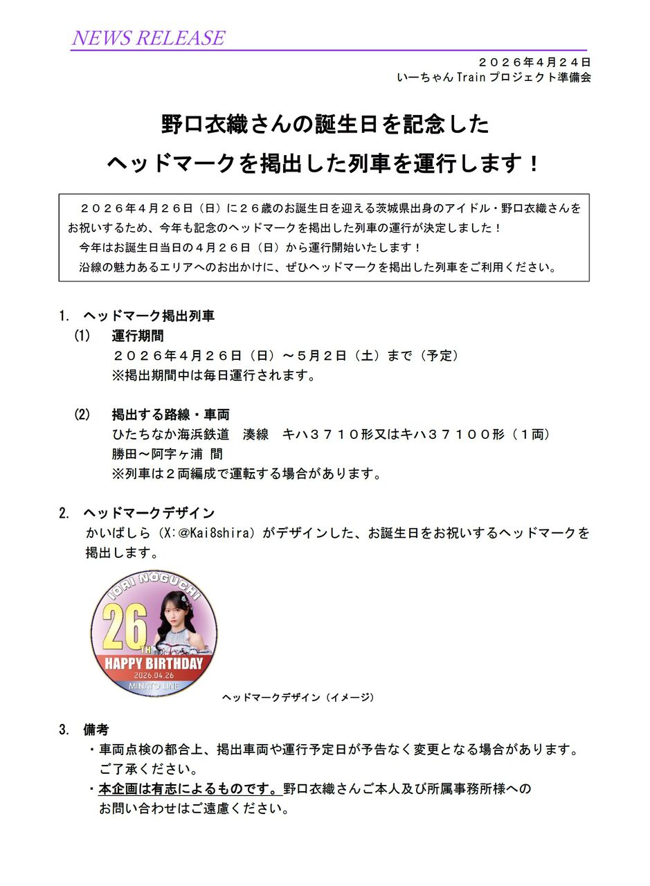 今年も、4月26日から、野口衣織さんの誕生日を祝うヘッドマークを掲示した列車を運行しています↓